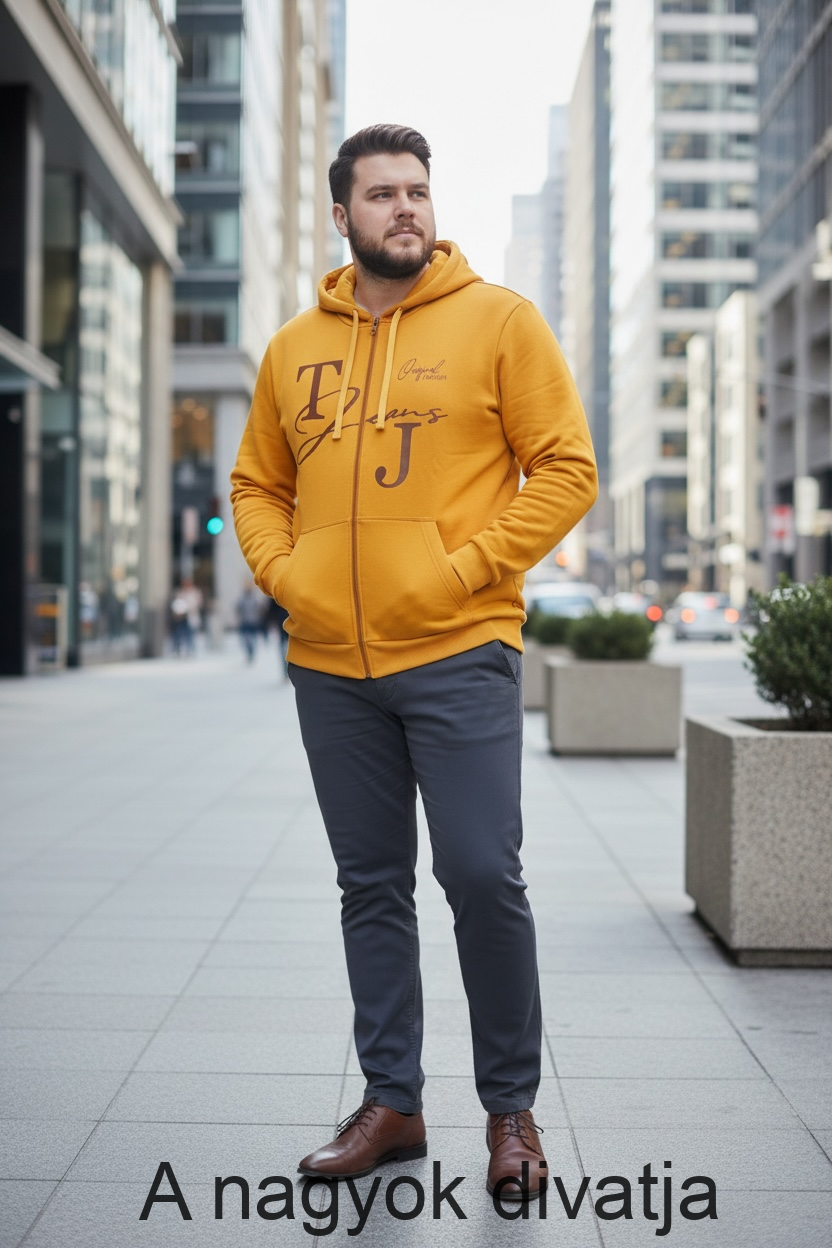Elől cipzáros, kapucnis, mustár színű férfi felső