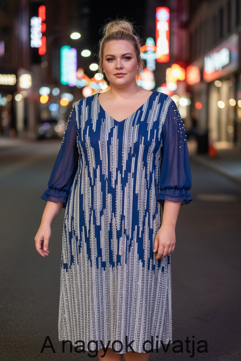 Látványos vízkék ruha ezüst strasszokkal, gyöngyökkel díszítve, muszlin ujjal kombinálva,amely elegánsan kiemeli a karokat. Különleges választás ünnepi alkalmakra vagy báli eseményekre.