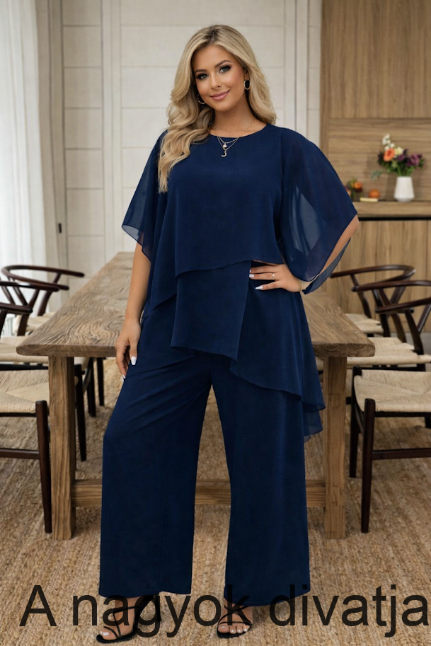 Muszlin kétrészes, bővebb de egyeses szárú nadrág + 34 ujjú felsőrész, mely srégen szabott, réteges.