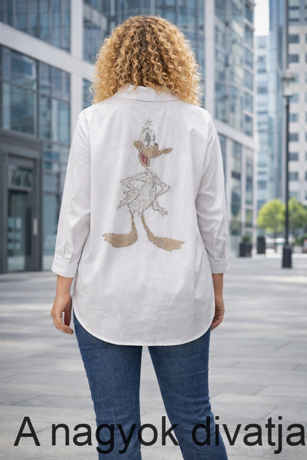 Pamutvászon, fehér, strasszkővel kirakott donald kacsás női ing.