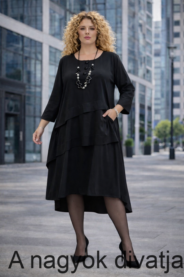 Elegáns , réteges szabású fekete ruha, amely laza esésével és nőies vonalvezetésével, kényelmes, mégis kifinomult megjelenést biztosít.