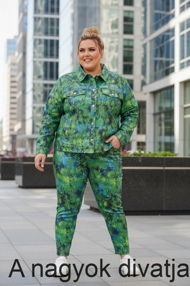 Pálmaleveles mintázatú, nagyon elasztikus Bengalin anyagból készült ceruza szabású nadrág és rövidebb állású dzseki szett. Melynek akár a nadrágja és a dzsekije külön-külön is megvásárolható.