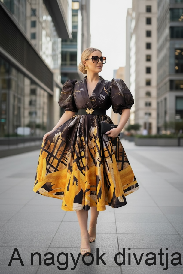Elegáns, művészi mintájú ruha , látványos puffos ujjakkal és karcsúsított derékkal, amely nőies megjelenést biztósit.